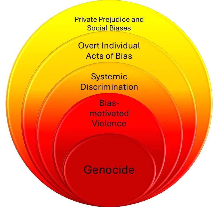 The Pyramid of Hate illustrates the prevalence of bias, hate and oppression in our society. It is organized in escalating levels of attitudes and behavior that grow in complexity from bottom to top. Like a pyramid, the upper levels are supported by the lower levels; unlike a pyramid, the levels are not built consecutively or to demonstrate a ranking of each level. Bias at each level reflects a system of oppression that negatively impacts individuals, institutions and society. Unchecked bias can become “normalized” and contribute to a pattern of accepting discrimination, violence and injustice in society. While every biased attitude or act does not lead to genocide, genocide takes place within a system of oppression in which the attitudes and actions described at the lower levels of the pyramid are accepted. When we challenge those biased attitudes and behaviors in ourselves, others and institutions, we can interrupt the escalation of bias and make it more difficult for discrimination and hate to flourish. [sic]